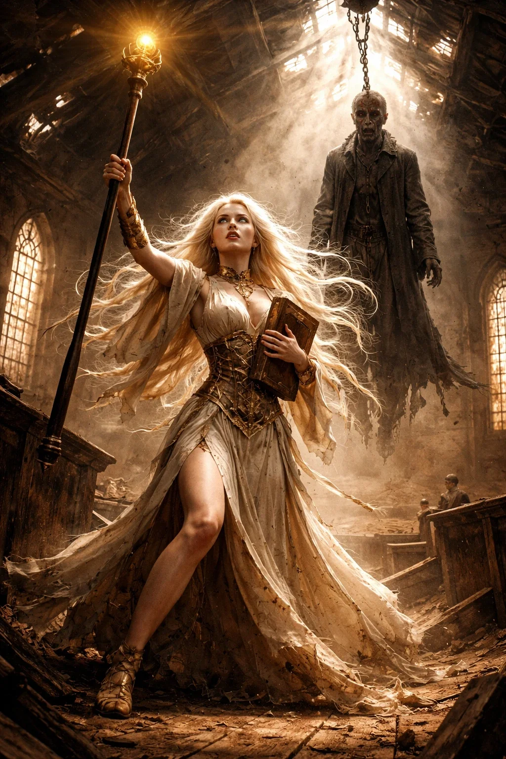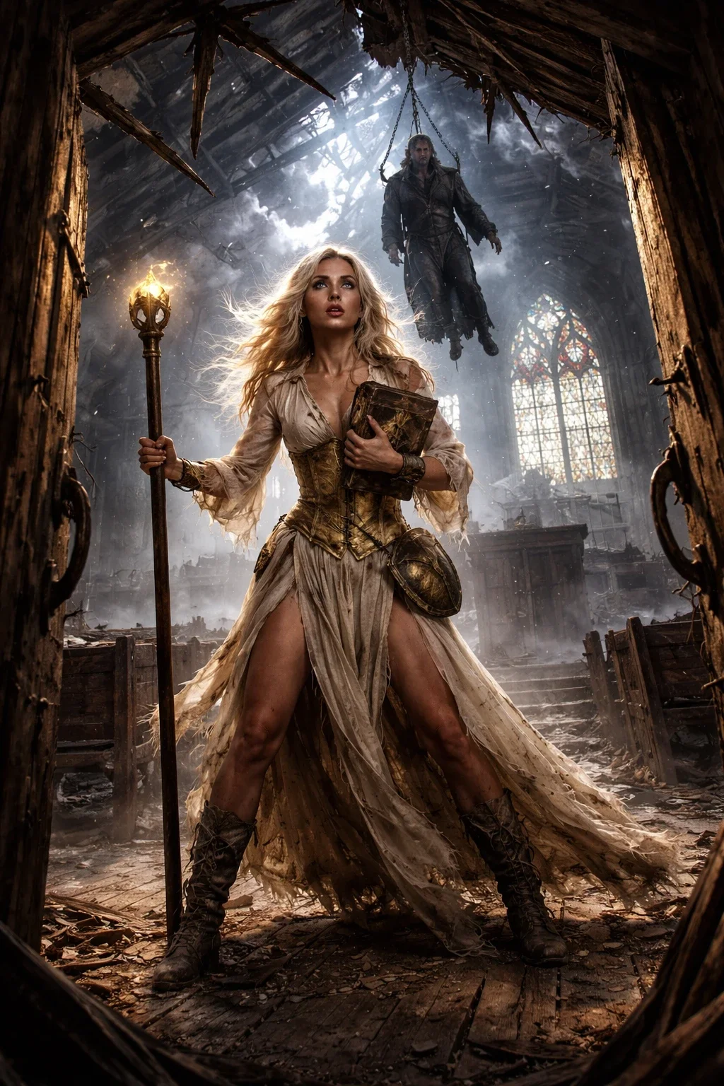 Sherilyn staggers, her bruised ribs screaming as she catches herself against a splintered pew. The mother. There was a mother. She remembers hands grabbing at her robes, a voice pleading, a child crying—but the face has become a blur, eyes lost to the Preacher's hunger. She had promised to remember them. All of them. Every soul the Cascade couldn't save. "NO!" She forces herself upright, blood pulsing in her temples. "The names are WRITTEN! The faithful RECORD! We do not trust memory alone—we INSCRIBE!" Her hand finds the Devil's Ledger at her chest, and she understands suddenly why this cursed book chose her. Why it burns against her heart like a second pulse. "You eat memories, Preacher? Then EAT THIS!"