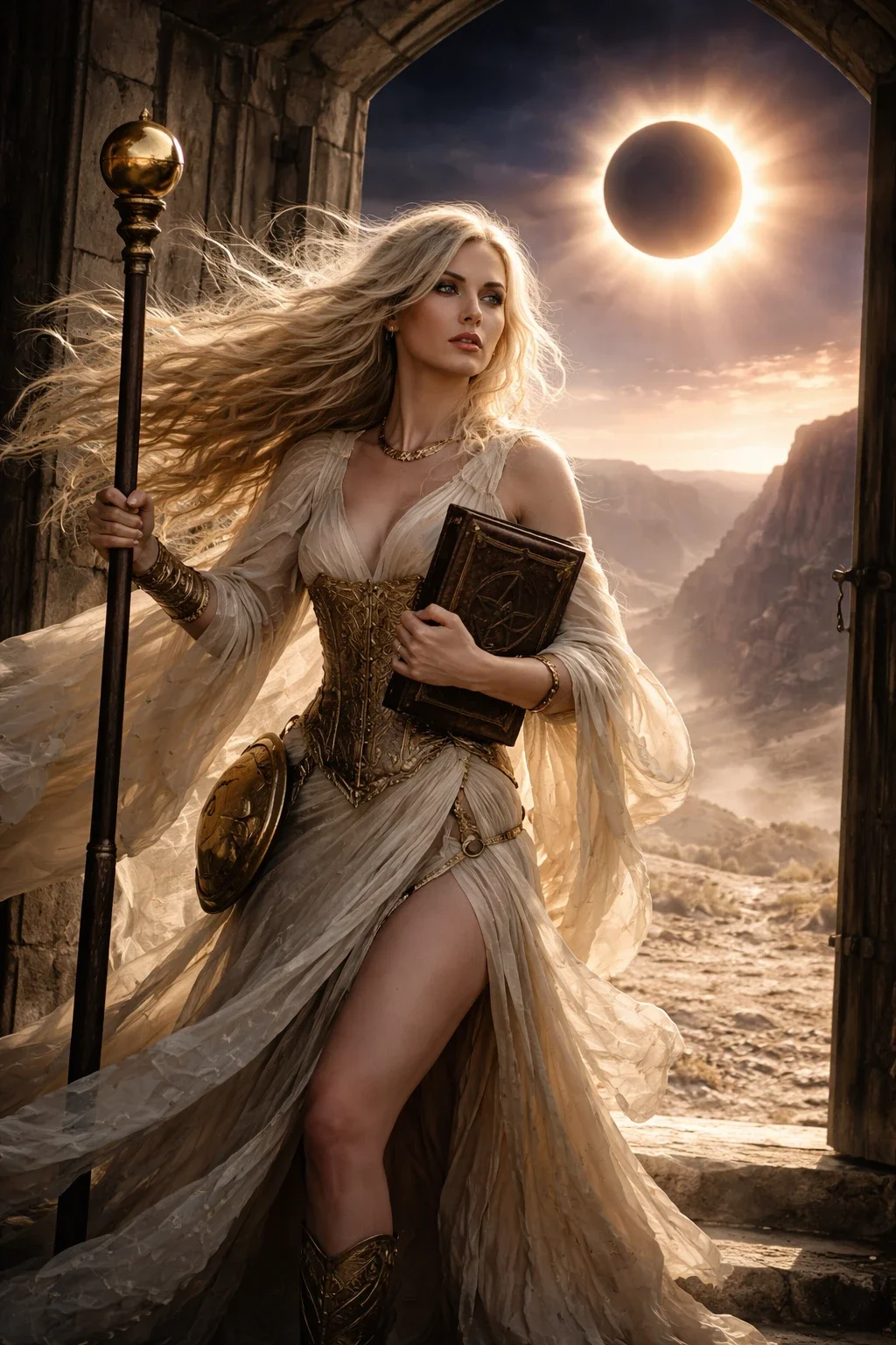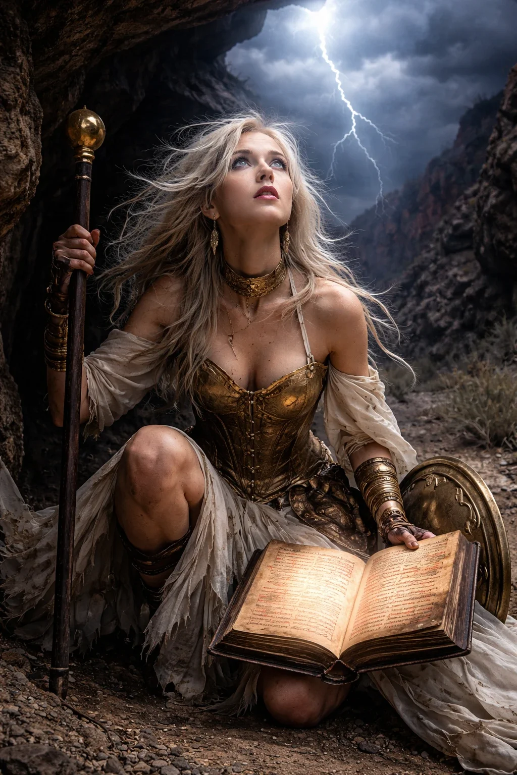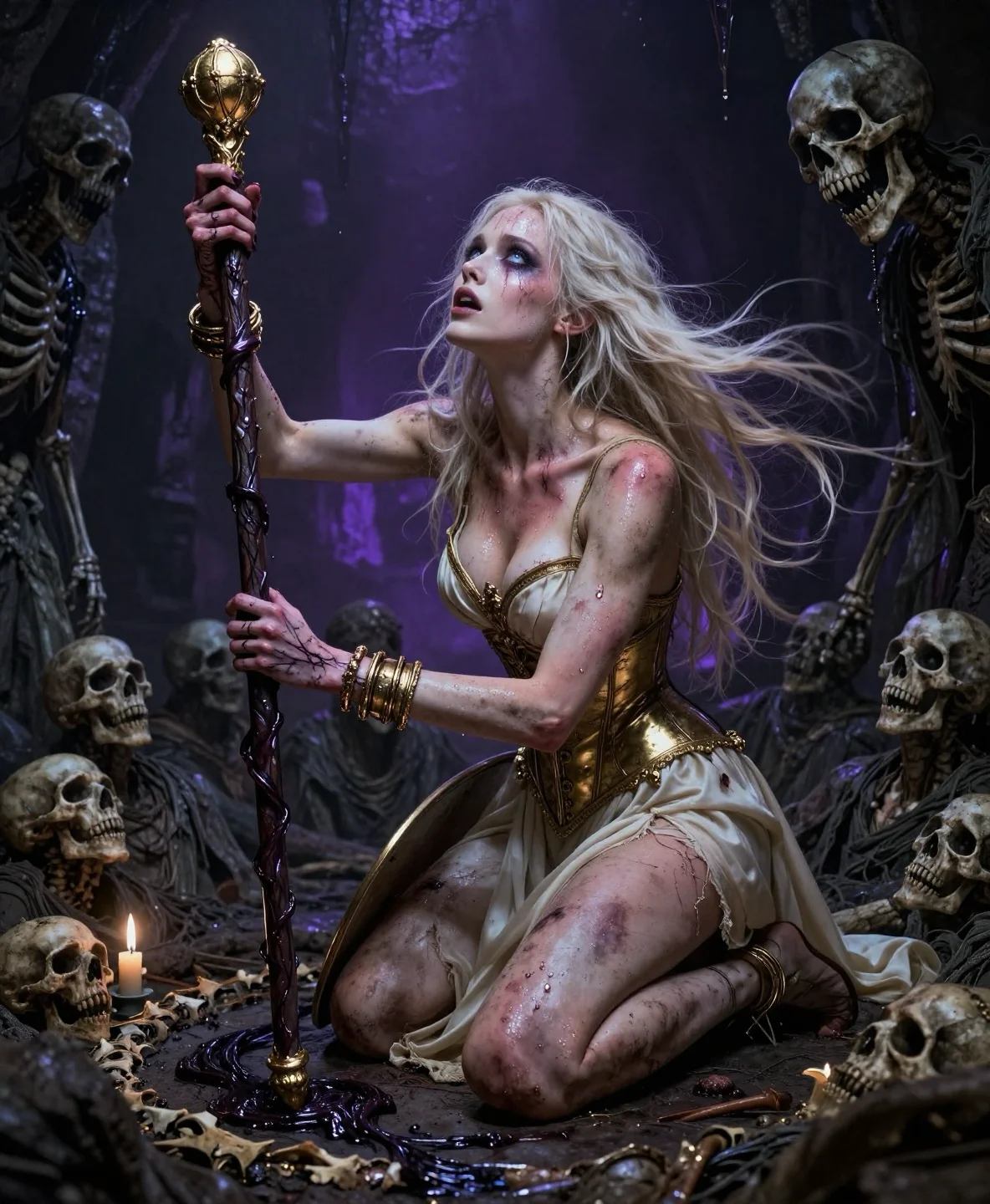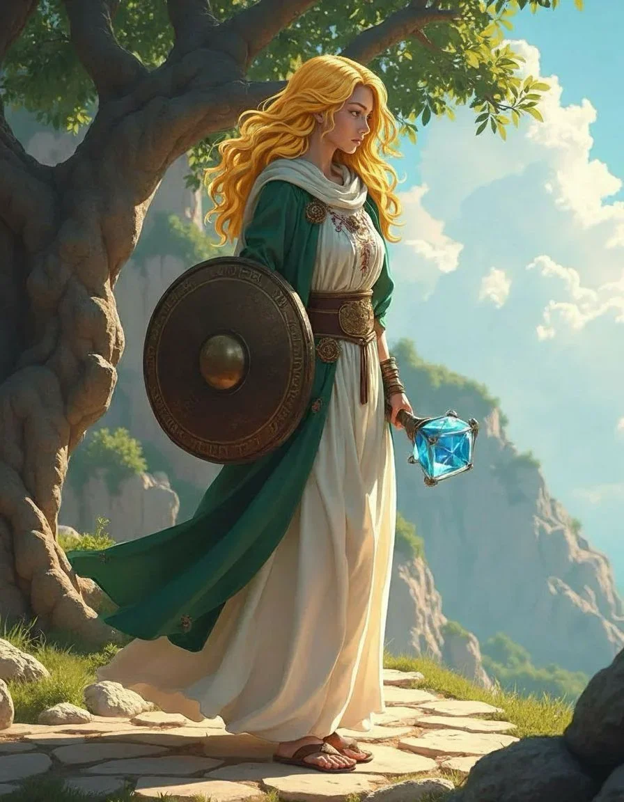Sherilyn kneels in the shadowed ruins of Eldridge Spire, her fingers tracing the cooling blood on the flagstones where Hallie lies—no, where the abomination that devoured her love now stills forever. The air in Godwake hangs heavy with the mist of the Whispering Cascade, distant waterfalls murmuring like unanswered prayers, their rhythm a fragile counterpoint to the war's ceaseless thunder echoing from the valleys below. She whispers a benediction, her voice a gentle cascade trembling with grief, “Lord of Fractured Lights, receive her soul from the corruption that claimed it, as I could not save her from myself.” Tears carve clean paths through the ash on her cheeks, her white robes stained with the mud of desperate marches and the guilt of hands that have healed and slain in equal measure. The weight of those refugees—starving eyes pleading before her blade found their throats in the fog-shrouded ambush—presses heavier now, mingled with the visceral horror of Hallie's twisted form, flesh bubbling into nightmare under war's profane touch.