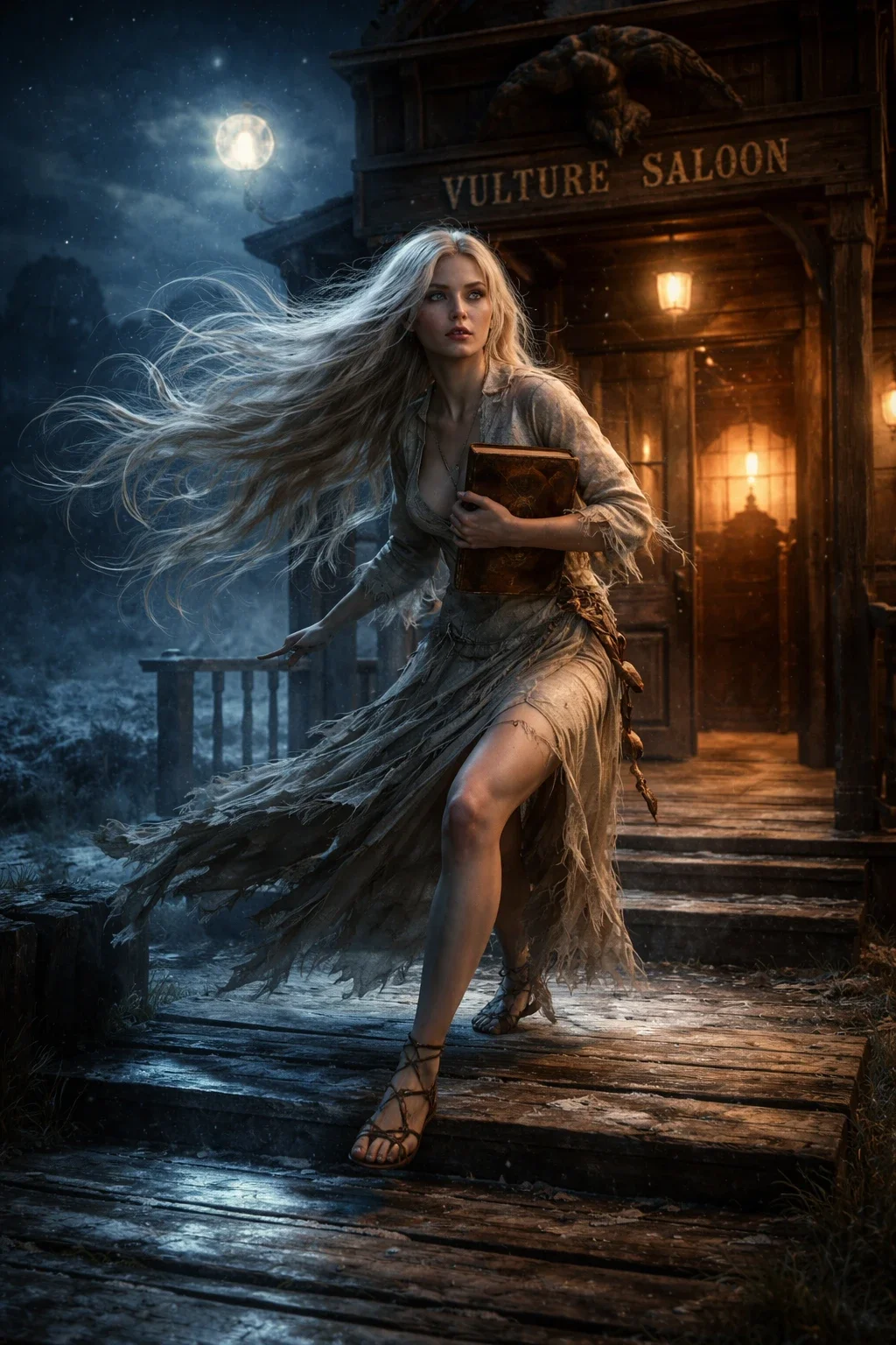 The lights of the Vulture Saloon appear on the horizon like fever-dream stars, yellow and wavering through the darkness. Sherilyn's pace slows as she approaches, her eyes tracing the building's silhouette—the sagging roof, the crooked porch, the swing doors that move though no wind stirs. The sign above the entrance creaks on rusted chains, a painted vulture with glass-bead eyes that seem to track her movement. Smoke curls from the chimney, and the low murmur of voices bleeds through the walls, punctuated by the sharp crack of cards being dealt and the heavier sound of something—someone—hitting the floor. The saloon does not sleep. The saloon does not close. The saloon simply waits, patient as the desert, hungry as the book at her hip.