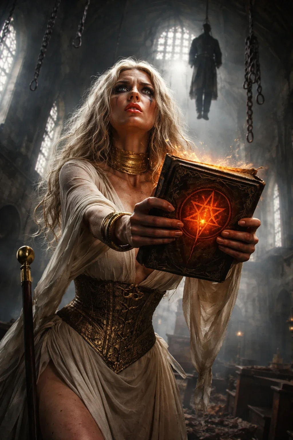 Sherilyn drives the Ledger toward the Preacher's suspended form, and the book answers her call with a roar of invisible flame. Pages whip backward, settling on a spread that bleeds fresh ink across yellowed parchment—THE HANGED PREACHER. DEBT: UNPAID. COLLECTION: NOW DUE. The words writhe like living things, and the Preacher's chains groan overhead as something begins to pull. Not downward. Inward. Toward the book.