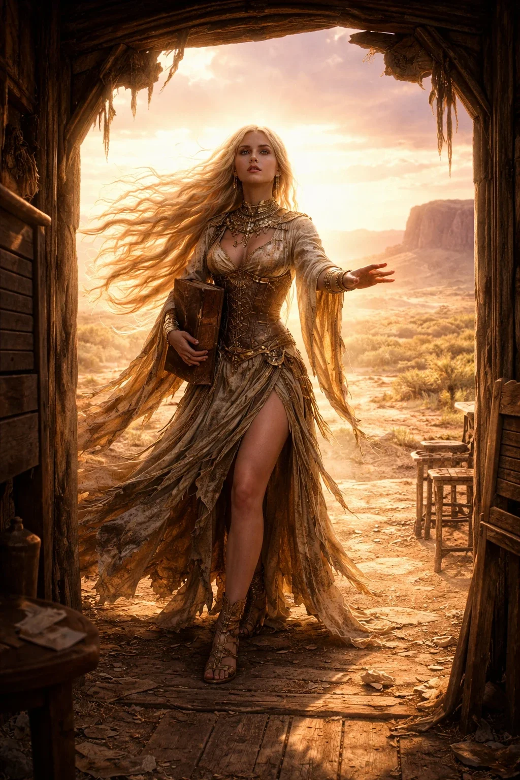 Sherilyn pushes through the swing doors, and the noise of the Vulture Saloon hits her like a physical wall—laughter, cursing, the clatter of poker chips and the wet gurgle of someone drowning in their own blood at the corner table. Smoke hangs thick beneath the ceiling beams, curling gray and brown from cheap cigars and something sweeter underneath, something that stings her eyes and coats her tongue with the taste of burnt poppy. The floorboards are sticky with spilled liquor and things she does not want to examine too closely, and her sandals squelch with each step as she moves into the room. The patrons barely glance at her—a dust-coated woman in tattered robes draws little interest in a place where men play cards with their teeth on the table and a corpse slumps against the bar with no one bothering to move it.