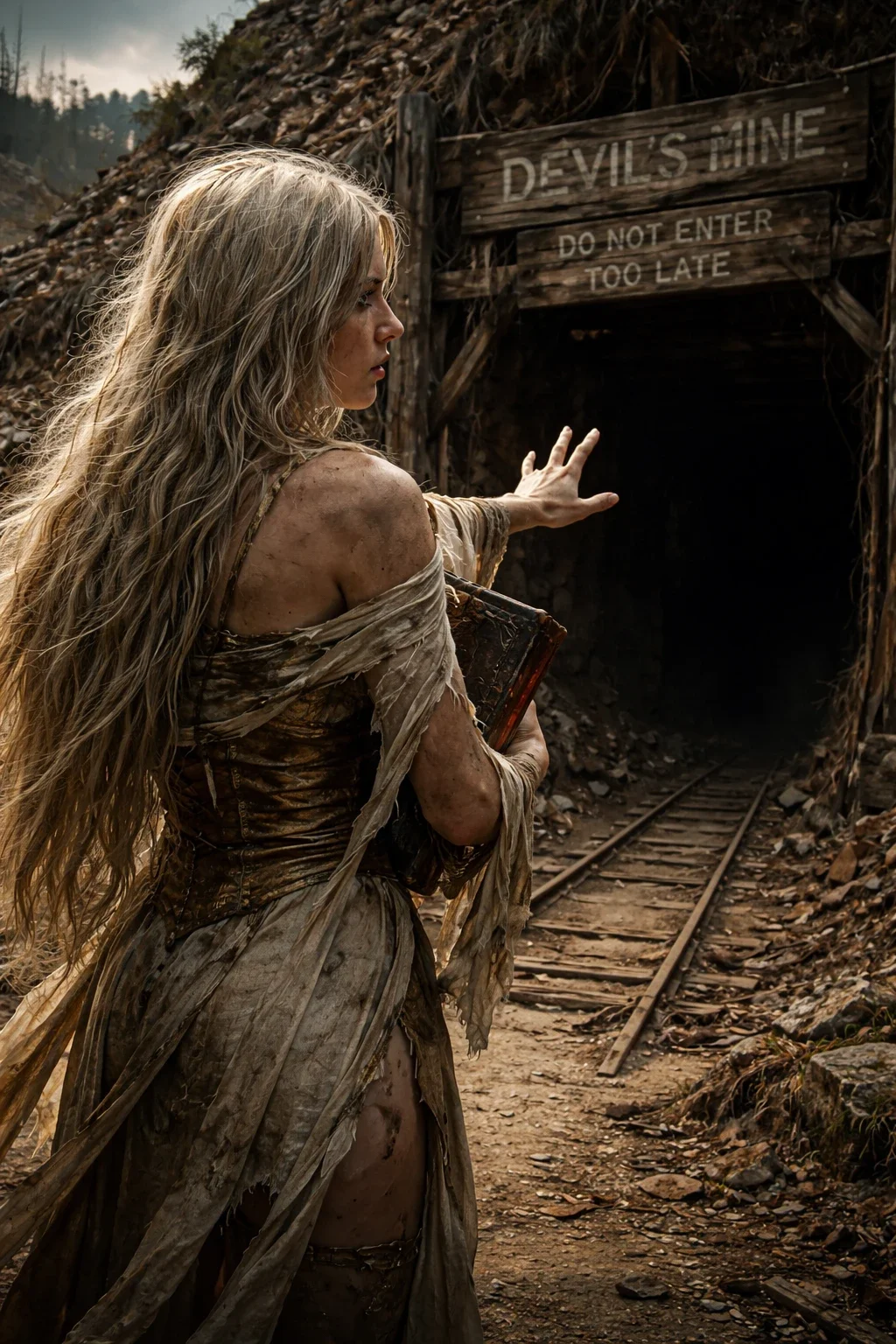 She circles the settlement's edge, keeping to the shadows beyond the lantern-light. The ground slopes downward as she moves—gentle at first, then steeper, cut with drainage ditches and the scars of old wagon paths. The smell changes. Woodsmoke gives way to something older, wetter. Mineral and rot. She hears the town behind her—laughter from a saloon, the clatter of poker chips, a woman's voice raised in song—but it fades as she descends. The mine entrance reveals itself in stages: first a dark mouth gaping in the hillside, then the remnants of a headframe silhouetted against the sky, then the rusted tracks of a mine cart system disappearing into blackness. A wooden sign hangs crooked from a post, words barely visible in the moonlight: DEVIL'S MINE. Someone has scratched beneath it in white chalk: DO NOT ENTER. Another hand has added below that: TOO LATE.