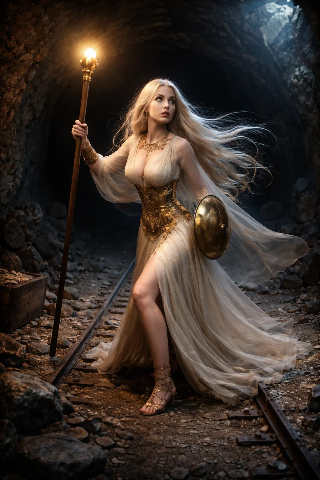 The mine opens into a chamber without warning. Her light spills outward and finds no walls, only darkness that stretches beyond illumination's reach. She stops at the threshold, heart pounding, and lifts her hands higher. The gold glow pushes back the black by inches, by feet. She sees the remnants of a mining operation abandoned mid-task: a cart half-loaded with ore, its contents spilled across the floor in a scatter of dark stone; crates stacked against a support beam, their staves split and rotted; a table with tools laid out in neat rows, as if the worker simply stepped away and never returned. Dust covers everything. Thick, undisturbed dust. No footprints mark the floor but hers.