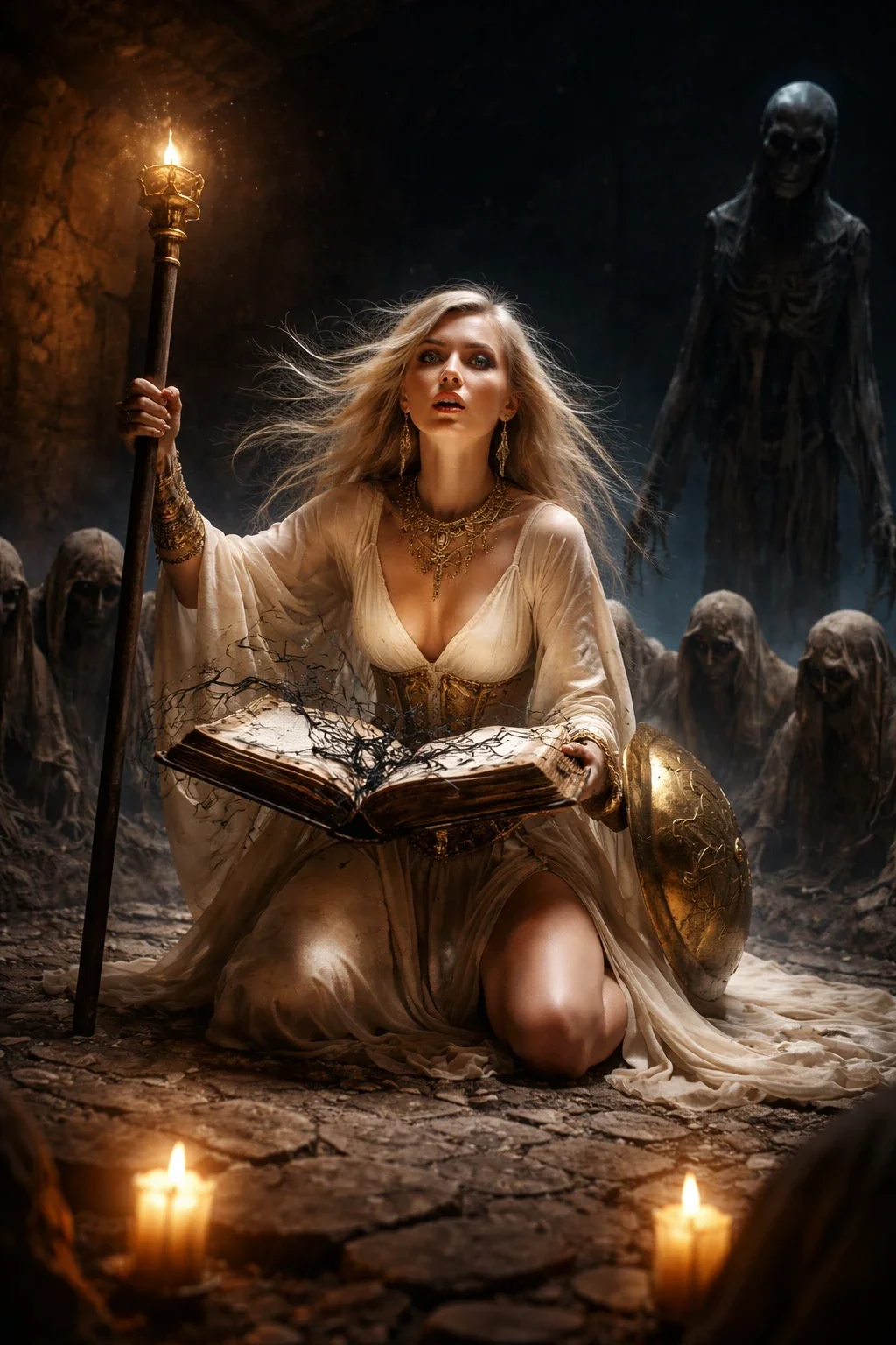 Footsteps sound behind her. Not the skittering of small things. Human steps. Measured. Slow. Coming from the darkness beyond her light, from the tunnel she descended, from the way she came. She turns, hands raised, prayer-light flaring, and sees nothing but the dark mouth of the passage. The footsteps stop. Silence floods the chamber, thick and suffocating, broken only by the rasp of her own breathing. Then a voice speaks from everywhere and nowhere, from the walls and the floor and the space behind her eyes: ‘"You carry the book. You carry the debts. What question burns enough to pay for an answer?"’